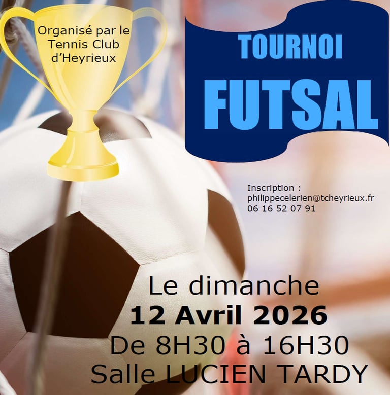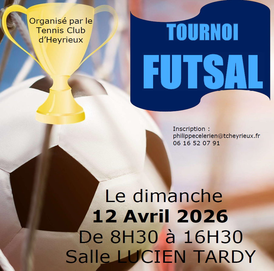 Le dimanche 26 avril 2026 de 8h30 à 16h30 à la Salle Lucien Tardy. Tournoi de futsall organisé par le tennis club d'Heyrieux